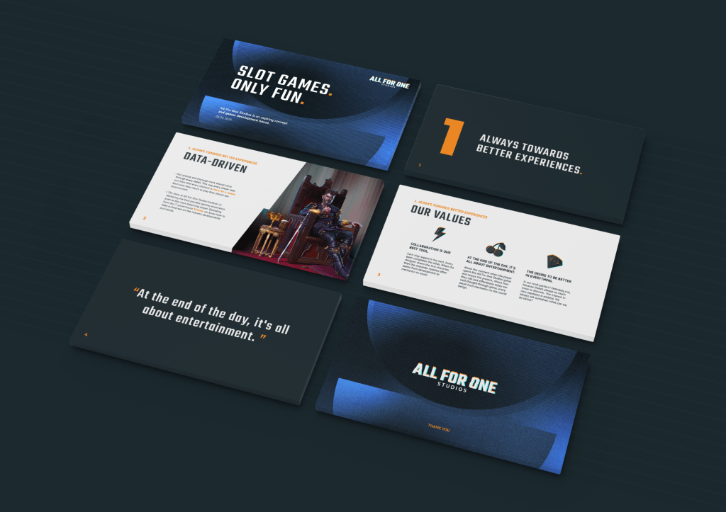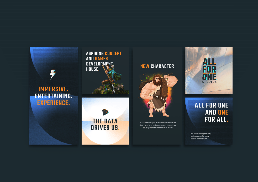 Lõime All For One stuudiole unikaalse logo ja visuaalse identiteedi, mis on inspireeritud loomingulisusest, meelelahutusest, ekraanide valgusest ja slotimängude põnevast maailmast. Unikaalsed ikoonid, efektne taustapilt, jõuline font ja kontrastsed värvid loovad silmapaistva ja meeldejääva kombinatsiooni ning annavad edasi ettevõtte olemust.